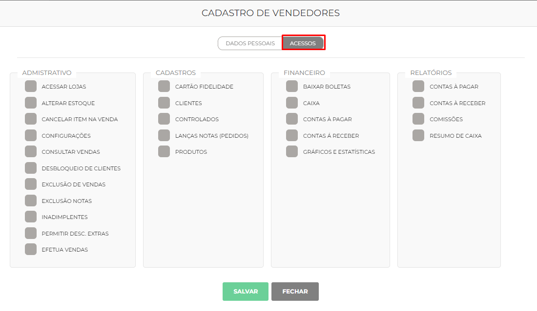 Preenchido primeira tela, ir para segunda aba ACESSOS, onde é permitido liberar permissões conforme perfil do vendedor: