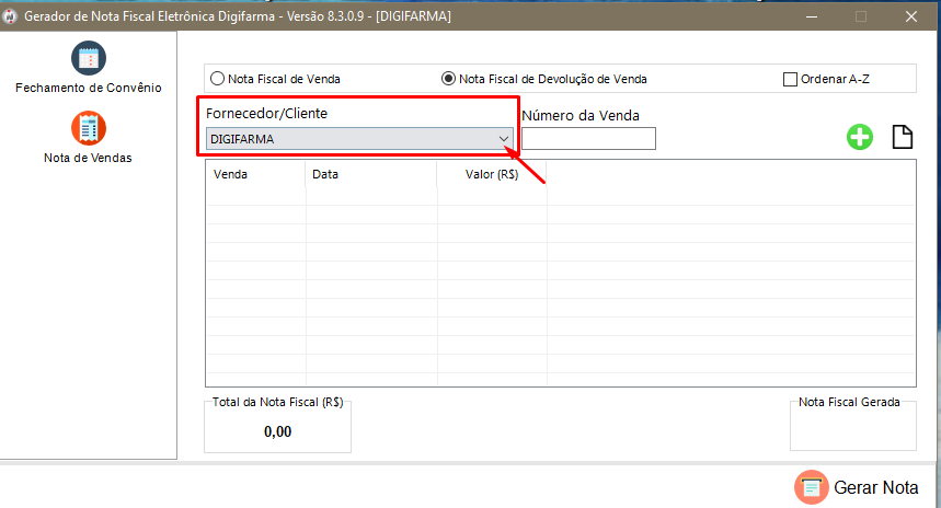 8. Com a venda informada, clique em Gerar Nota . Será informado o número da nota que foi criada.